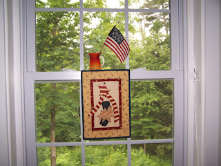 nora jean is sacked out on my large quilt which is on the back of my couch for the holidays. she looks comfy doesn't she! what are you doing for the holiday? we are still working hard on the house so we'll be spending the day here. last year we were able to see the fireworks from our kitchen window (where my little fire cracker wallhanging is) and i hope we'll be lucky this year.